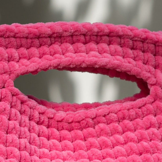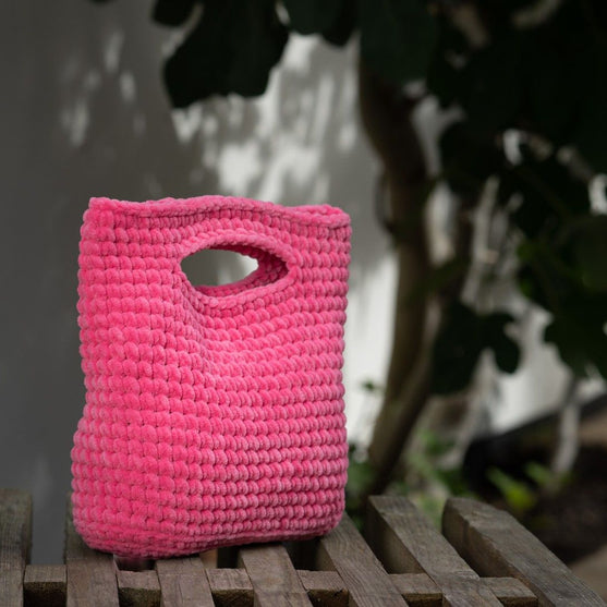 Zu Beginn wird der Boden als flaches Oval gehäkelt. Danach wird ohne Zunahmen bis zum Griff rund gehäkelt. Der wird dadurch geformt, dass man eine Anzahl Luftmaschen häkelt und die entsprechende Anzahl Maschen überspringt, bevor weiter gehäkelt wird.