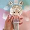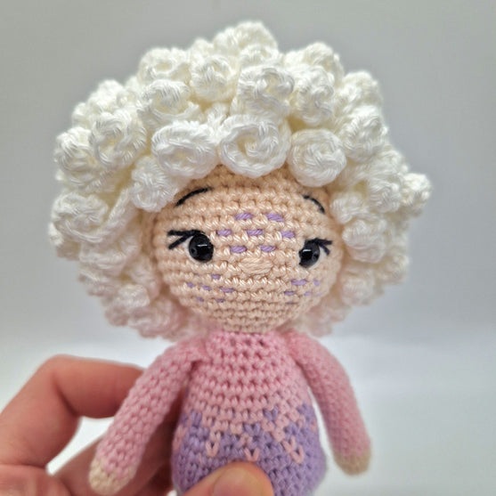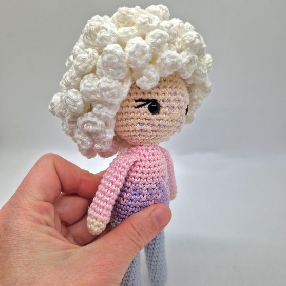 Sky ist inspiriert vom Element Luft. Die Farben erinnern an einen schönen Sommerhimmel, und das Haar an eine große flauschige Wolke. Die Herstellung ist etwas zeitaufwendig, aber auch ein großer Spaß!
