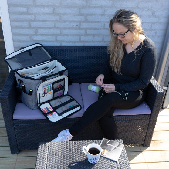 Es gibt eine Vielzahl an Außen- und Innentaschen, die verschiedene Strick- und Häkelnadeln, viel extra Garn und all das Zubehör für dich aufbewahren, das man braucht, wenn man an seinem Lieblingsprojekt arbeitet.