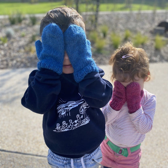 Die rosa Fäustlinge werden in der Größe Kleinkind 1-2 Jahre aus Winter Glow Solid in Farbe 33 (Ruby Chocolate) gestrickt, das mit Diablo Farbe 38 (Magenta) gehalten wird. Die blauen Fäustlinge werden in Kindergröße mit Winter Glow Solid Farbe 10 (Medici Blue) gestrickt, die mit Diablo 27 (Teal Blue) zusammengehalten wird.