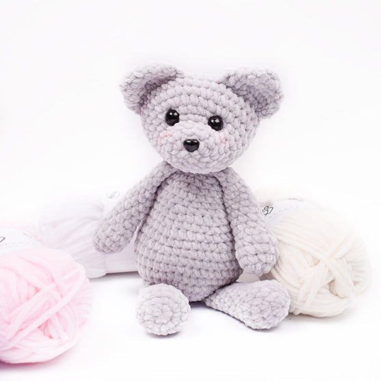 Er ist mit Snuggle Solid gehäkelt, einem dicken, kuscheligen und besonders weichen Mikrofasergarn, das eine sinnestimulierende Oberfläche hat und deshalb allerbestens für Baby- und Kindersachen geeignet ist und ganz besonders für so einen Knuddelfreund :)