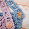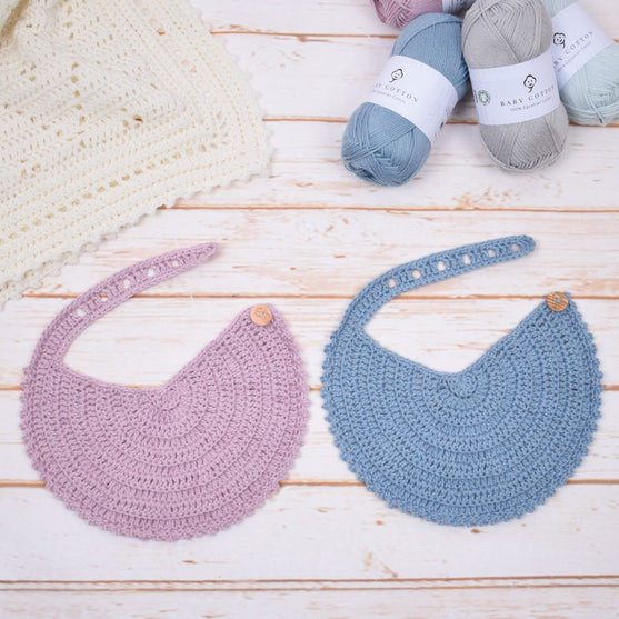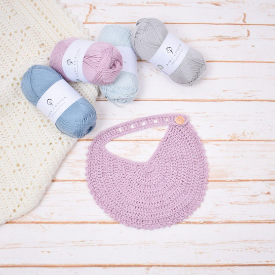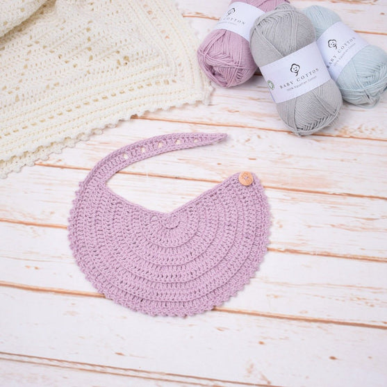 Das Lätzchen ist mit einem variablen Verschluss und einem niedlichen kleinen Knopf ausgestattet und kann in genau den Farben gearbeitet werden, die am besten in Babys Garderobe passen.