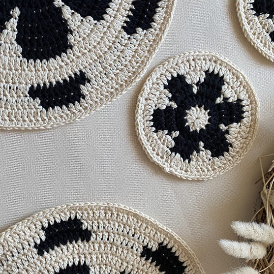 Wohndeko, die von Mary Quant, der Ikone der 60er Jahren und einem schwarz-weißen Retro-Blumenmotiv inspiriert ist.