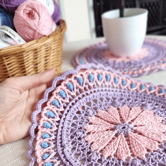 Dies ist eine Anleitung für ein rundes, texturiertes Tischset mit vielen 3D-Elementen. Sie ist für selbstbewusste Anfänger oder Fortgeschrittene geeignet. Das Projekt wird im Kreis gehäkelt und der Durchmesser des fertigen Platzsets beträgt ca. 25 cm.