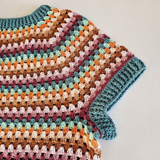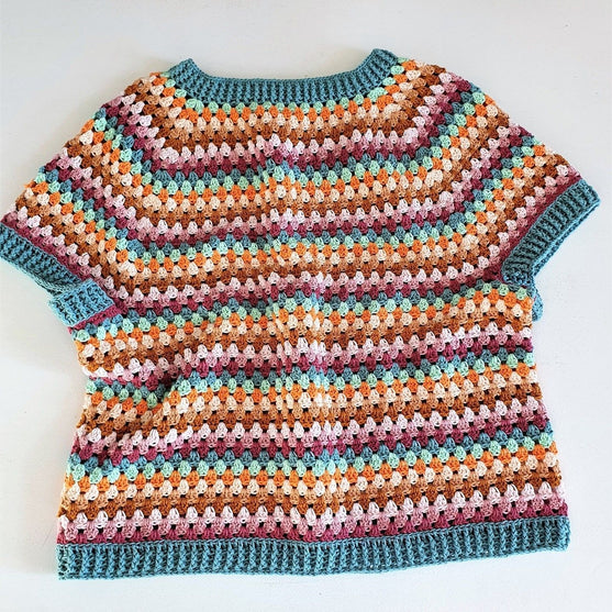 Häkle dir ein T-Shirt in fröhlichen Sommerfarben. Für dieses Modell, das von oben nach unten im klassischen Granny-Muster gearbeitet wird, werden 9 verschiedene Farben verwendet. Das Garn Friends Cotton 8/4 gibt es in 94 wunderschönen Farben, die nach Belieben gemischt werden können: Pastellfarben, kräftige Farben, mehrere oder weniger Farben. Verwende diese Anleitung als Grundmuster, stürze dich ins fröhliche Farbenspiel und kreiere dein ganz eigenes und einzigartiges Sommer-T-Shirt.