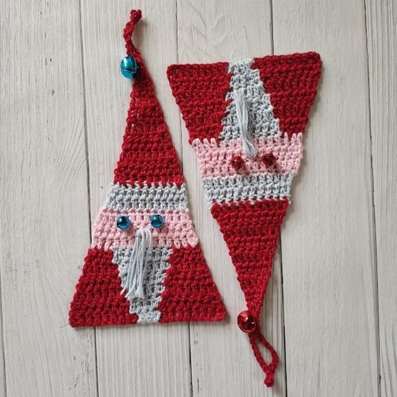Diese dreieckige Dekoration ist sehr einfach herzustellen. Der einzige komplizierte Teil ist der Körper von Santa Claus, der aus drei kleinen trapezförmigen Elementen besteht, die mit der „Join-as-you-go“-Methode (oder JAYG) verbunden werden. Diese Technik wird in der Anleitung durch fettgedruckte Kettmaschen (Km) angezeigt.
